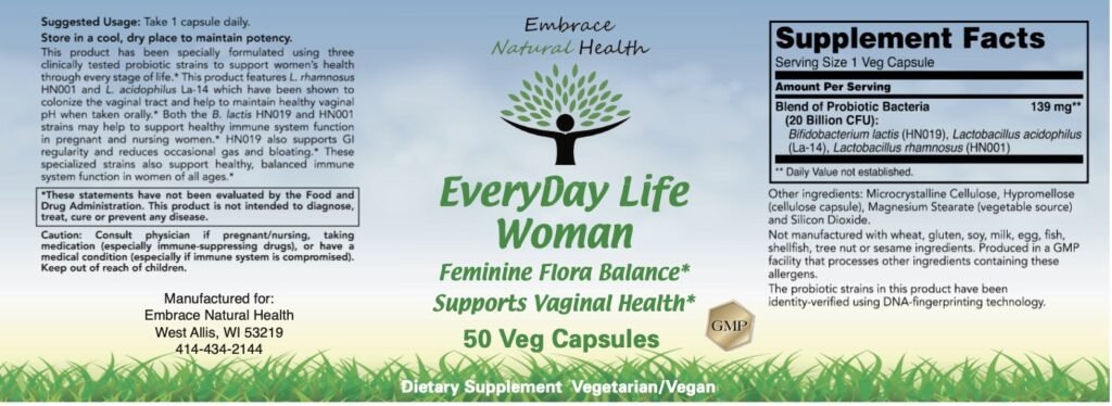 Everyday Life Woman Probiotic has been specially formulated with three clinically tested probiotic strains to support women’s health at every stage of life.* This advanced formula features L. rhamnosus HN001 and L. acidophilus La-14, which have been shown to colonize the vaginal tract and help maintain a healthy vaginal pH when taken orally.*